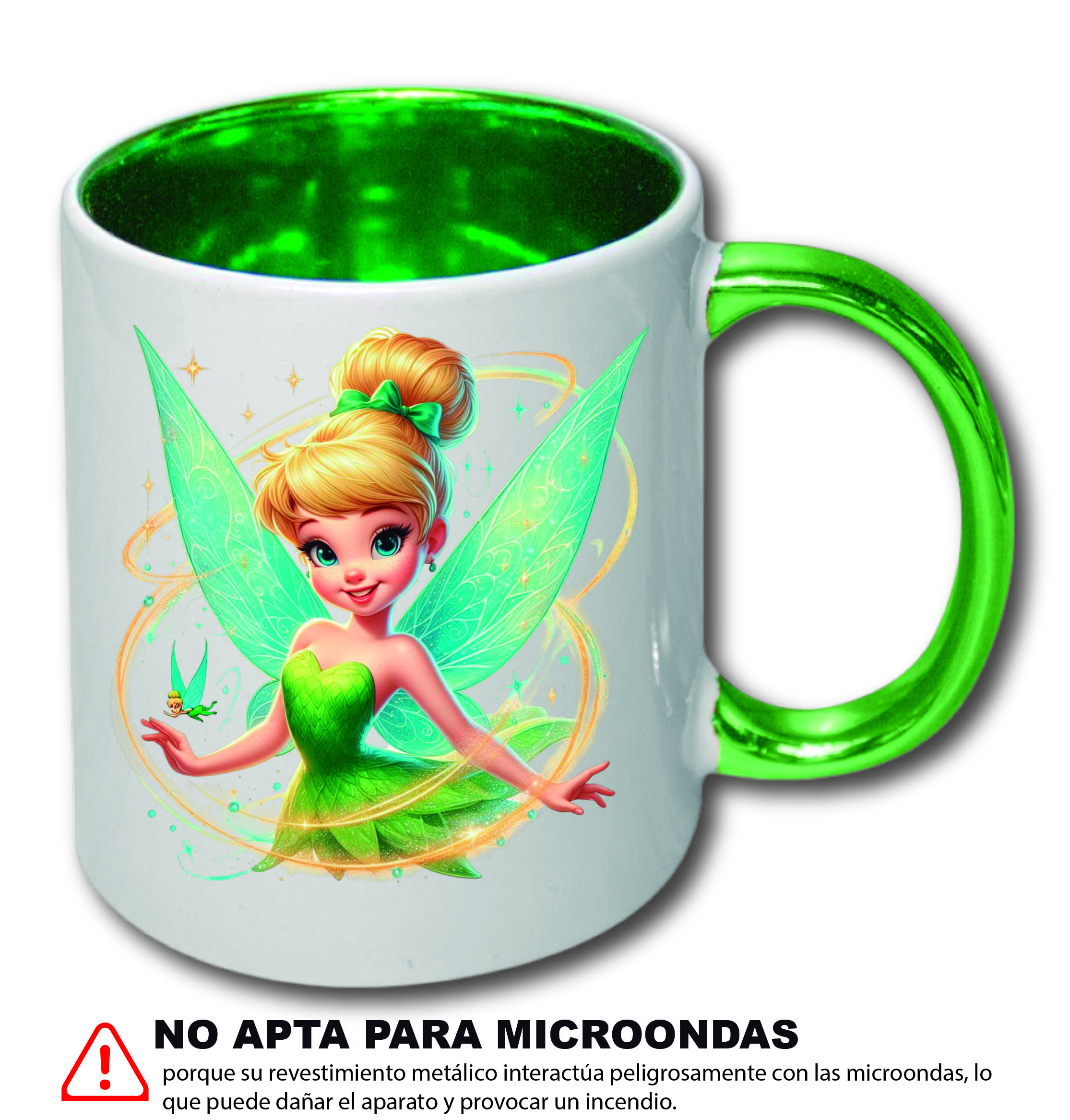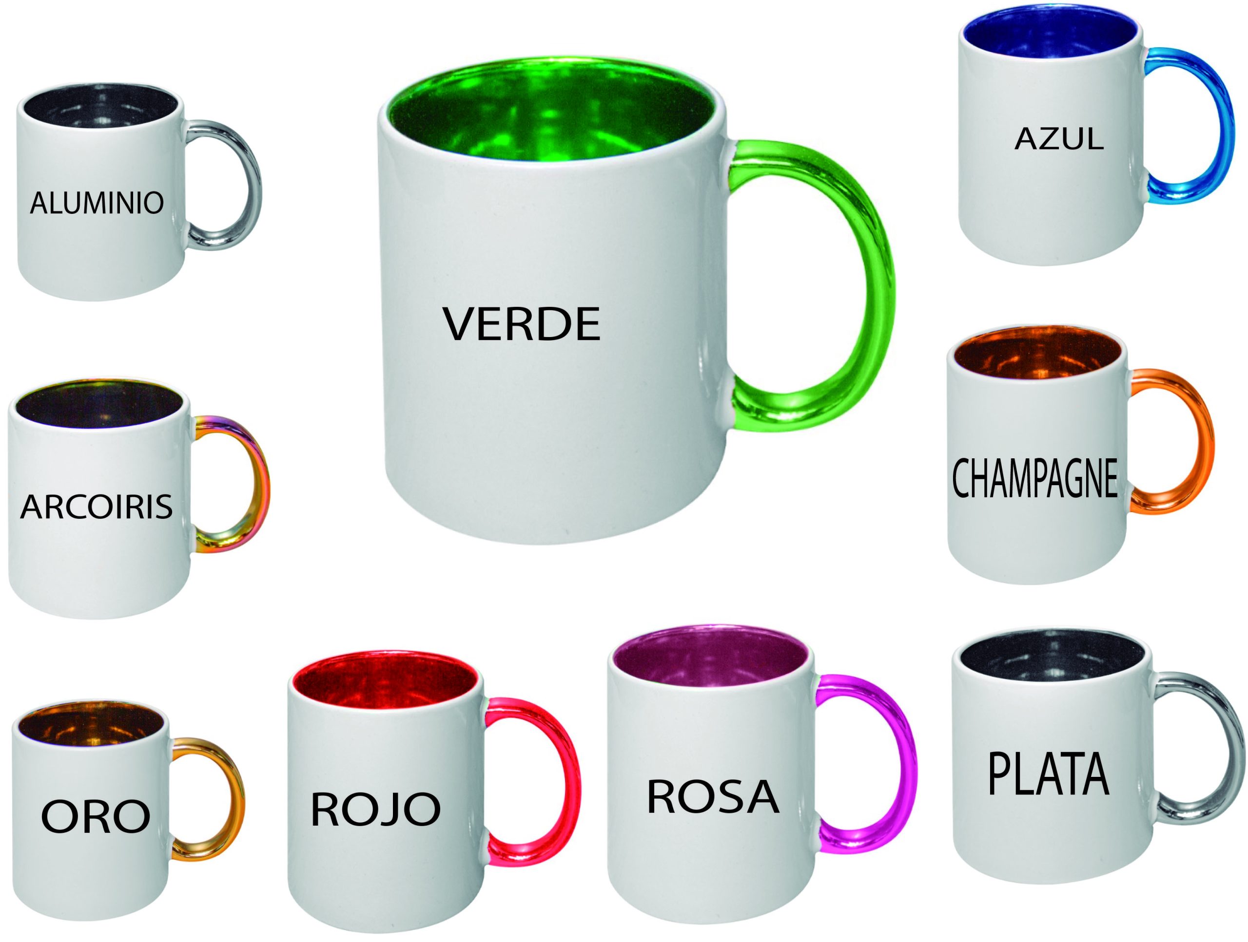 Taza de cerámica blanca personalizable con interior y asa acabado espejo, con recubrimiento de barniz polímero transparente.