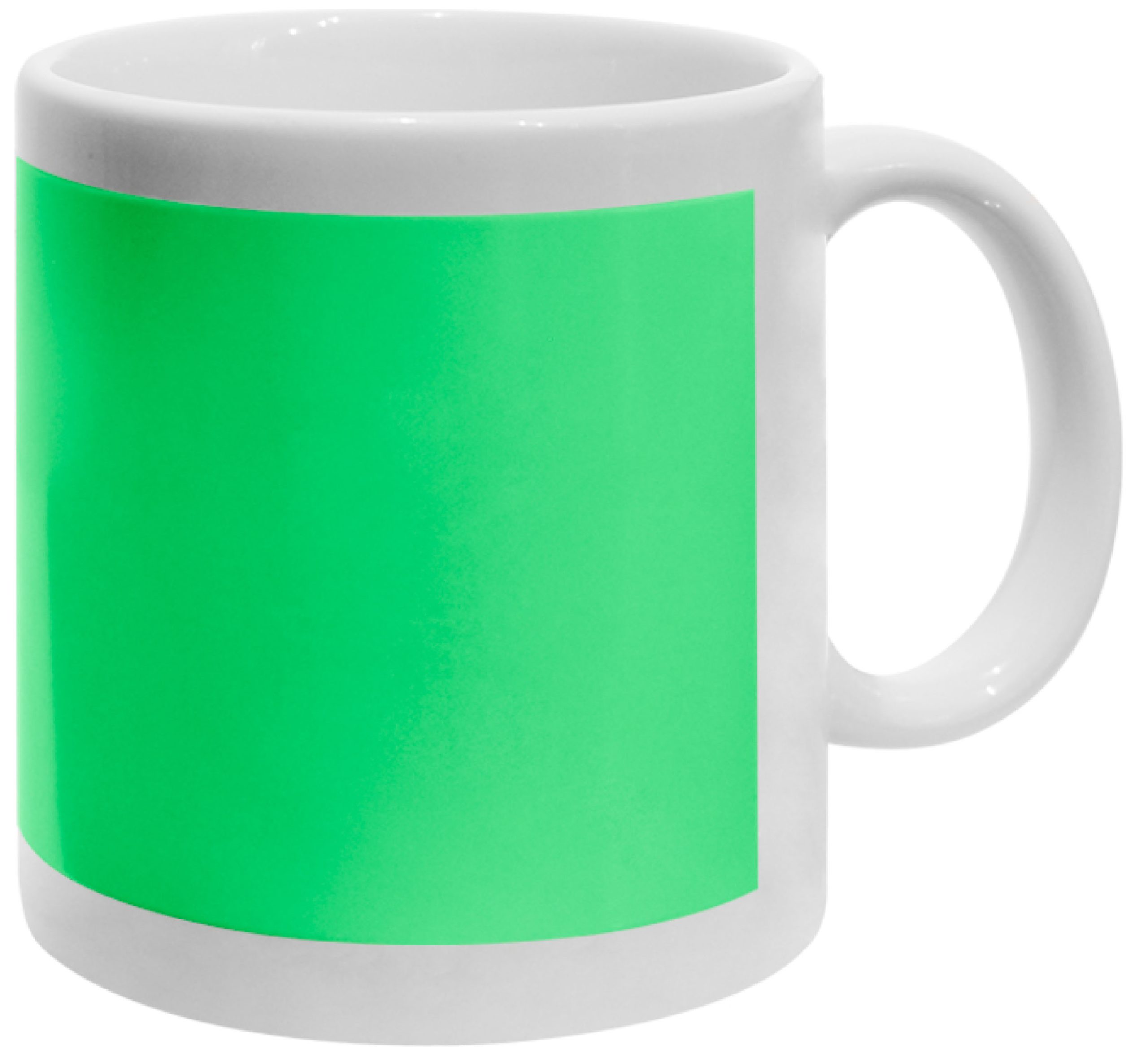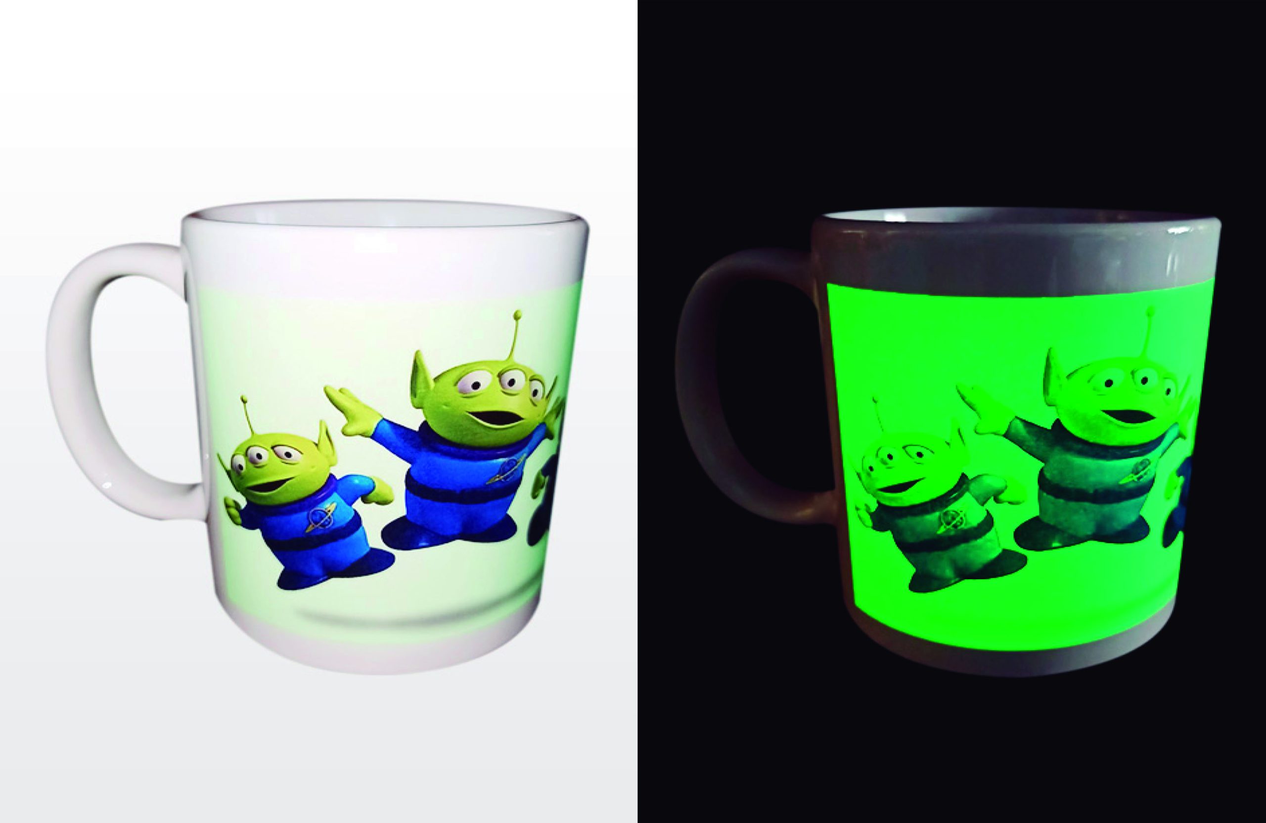 Taza de cerámica personalizable en color con área imprimible fotoluminiscente blanca recubierta con barniz poliéster para ser decorada por sublimación, grado alimenticio.